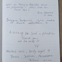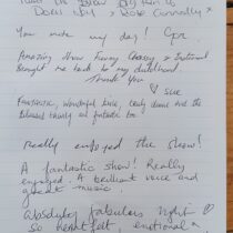 At each show, there will be a book for the audience to leave comments, thoughts, feelings etc. These handwriten notes are so special for myself and the band, as they will feed us throughout this tour.